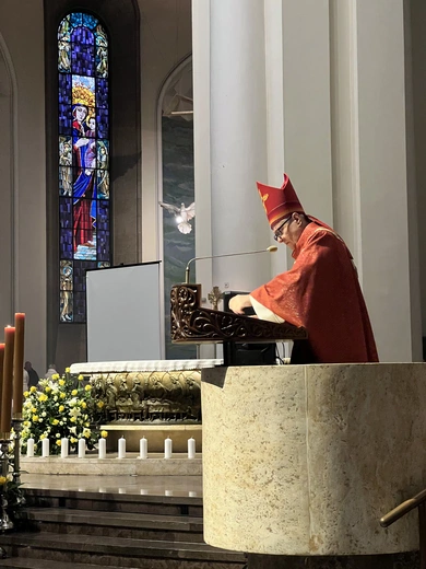 Eucharystii przewodniczył bp Adam Wodarczyk, biskup pomocniczy archidiecezji katowickiej, członek Zespołu ds. Nowej Ewangelizacji KEP. – My również, podobnie jak św. Andrzej, jesteśmy wezwani do gotowości, do odpowiedzi na wezwanie Chrystusa – podkreślił bp Wodarczyk. Przypomniał, że pierwszej odpowiedzi na to wezwanie prawdopodobnie większość zebranych nie zapamiętała, ponieważ udzielili jej w trakcie chrztu. Natomiast kolejny moment – wybór Jezusa na Pana i Zbawiciela oraz oddanie Mu życia – był przeżywany świadomie. – Pójście za Chrystusem często wiąże się z tym, że trzeba zrezygnować z tego, co daje nam poczucie bezpieczeństwa, stabilności. Podążamy za Chrystusem w drodze do świętości, każdy w swoim powołaniu: inaczej kapłani, osoby konsekrowane, inaczej ludzie świeccy, a jednocześnie wszyscy tak samo, na mocy chrztu, na mocy żywej wiary – dodał.