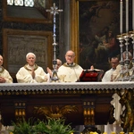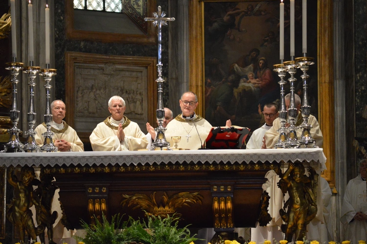 Mszy św. przewodniczył abp Andrzej Przybylski, metropolita katowicki, a koncelebrowali ją obecni na pielgrzymce biskupi i duszpasterze. Był to pierwsza wspólna modlitwa wszystkich grup – autobusowych i samolotowych – które przybyły do stolicy Włoch. Na początku Eucharystii abp Andrzej zachęcił wszystkich, aby w swoich modlitwach pamiętać o wszystkich sprawach naszej archidiecezji. Prosił również o to, aby modlitwą otoczyć tych, którzy pozostali w domach, szczególnie zaś arcybiskupów seniorów Damiana i Wiktora oraz arcybiskupa Adriana.